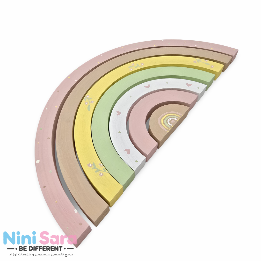 این رنگینکمان از ۷ قطعهی چوبی ساخته شده که هرکدام اندازهی متفاوتی دارند و داخل هم قرار میگیرند.