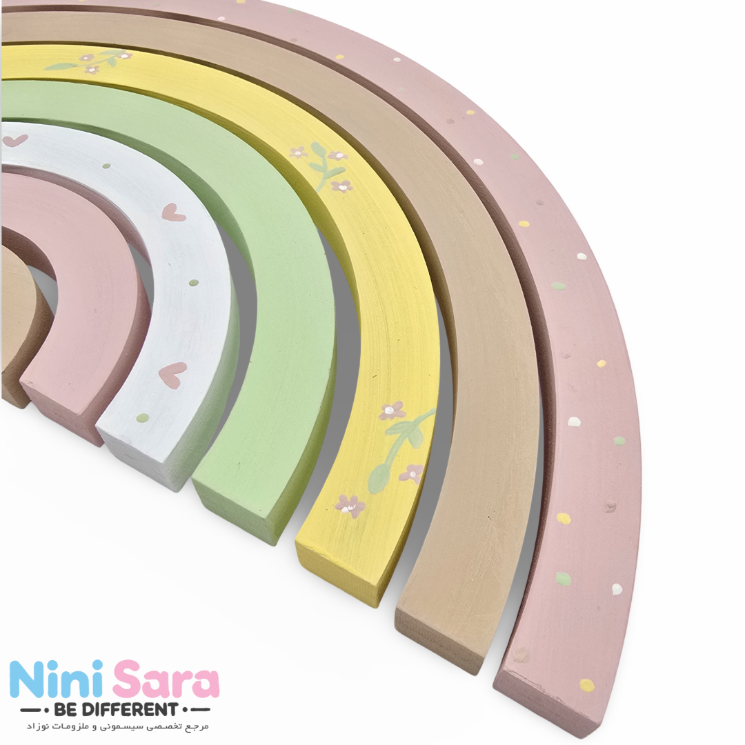 رنگینکمان چوبی با رنگهای ملایم، طرحهای نقاشی شدهی دستی و قوسهای هماهنگ، یک المان دکوری فوقالعاده برای اتاق کودک است.