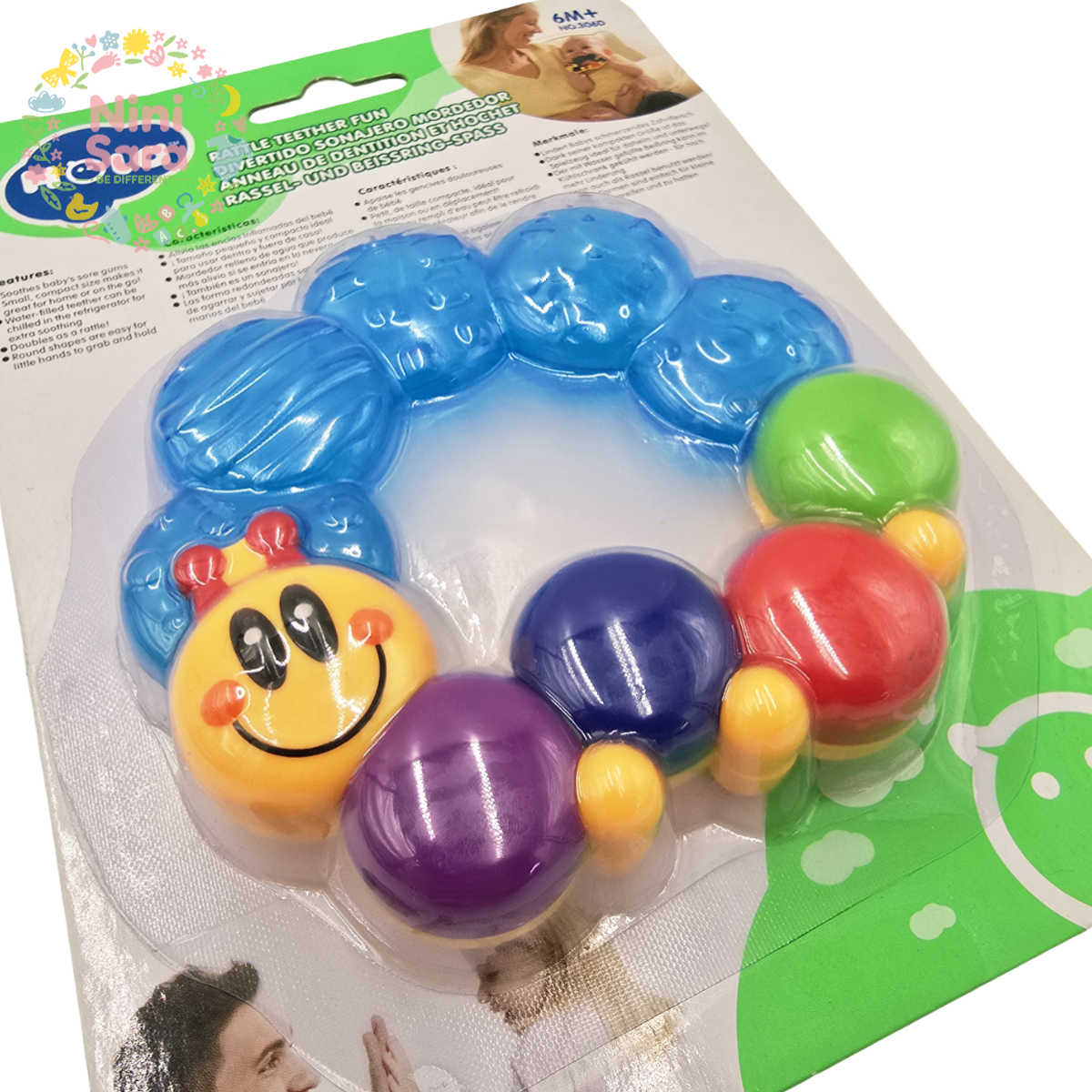 این محصول یه دندانگیر حلقهای رنگارنگ با طراحی کارتونی و جذابه که دور تا دورش از قسمتهای برجسته و بافتدار تشکیل شده. همین برجستگیها باعث میشه وقتی نوزاد اون رو میجوه، فشار ملایمی به لثه وارد بشه و خارش و التهاب کاهش پیدا کنه.